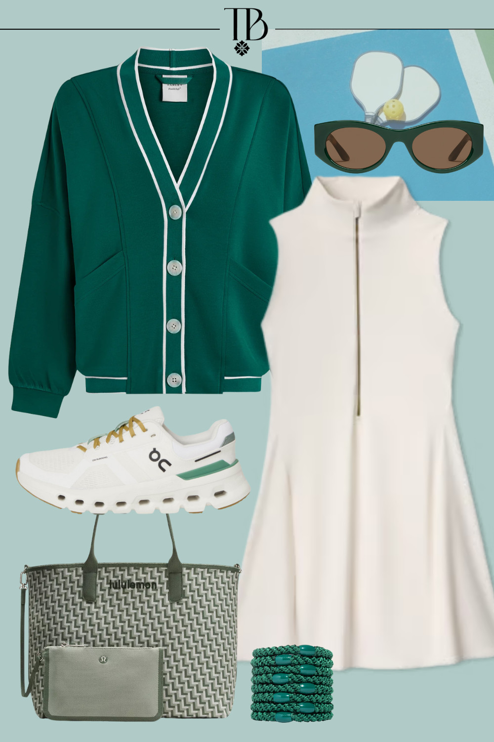 From the pickleball courts to lunch with the ladies, this fabulous look will carry you through the fall season with ease! I love how effortlessly put together this forest green cardigan is, especially when paired with the crisp white mock neck sport dress. Also… can you believe this tote bag is from lululemon?? Simply fabulous!