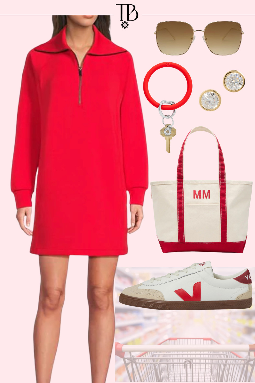 This is one of those fall athleisure outfits that has my name written all over it! I’m obsessed with all of my SPANX AirEssentials pieces, and this dress is next on my list. With such a bold red fabric I just had to add a few red accessories… the monogrammed tote bag, the sneakers, the keychain, all just the cherry on top of this look!