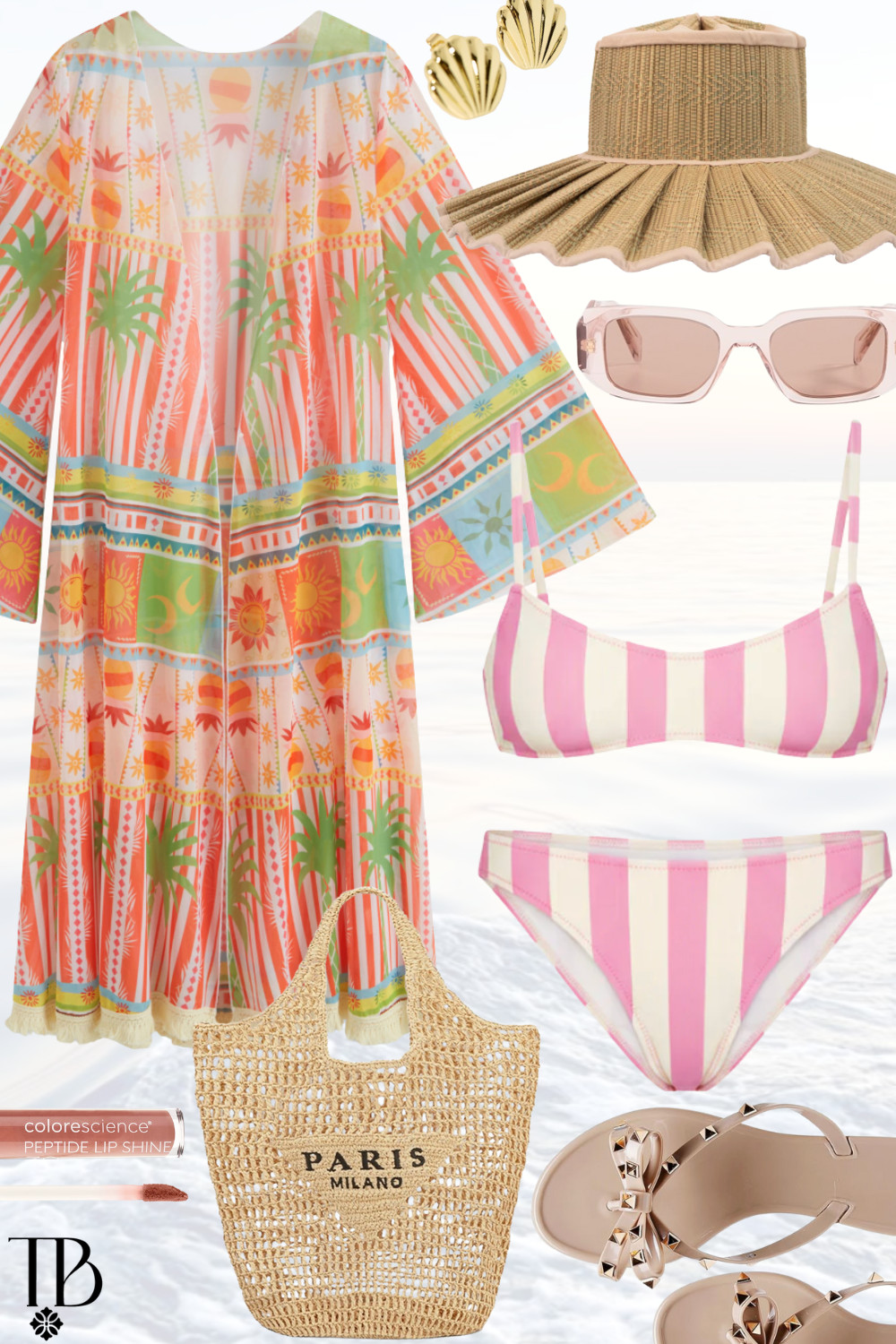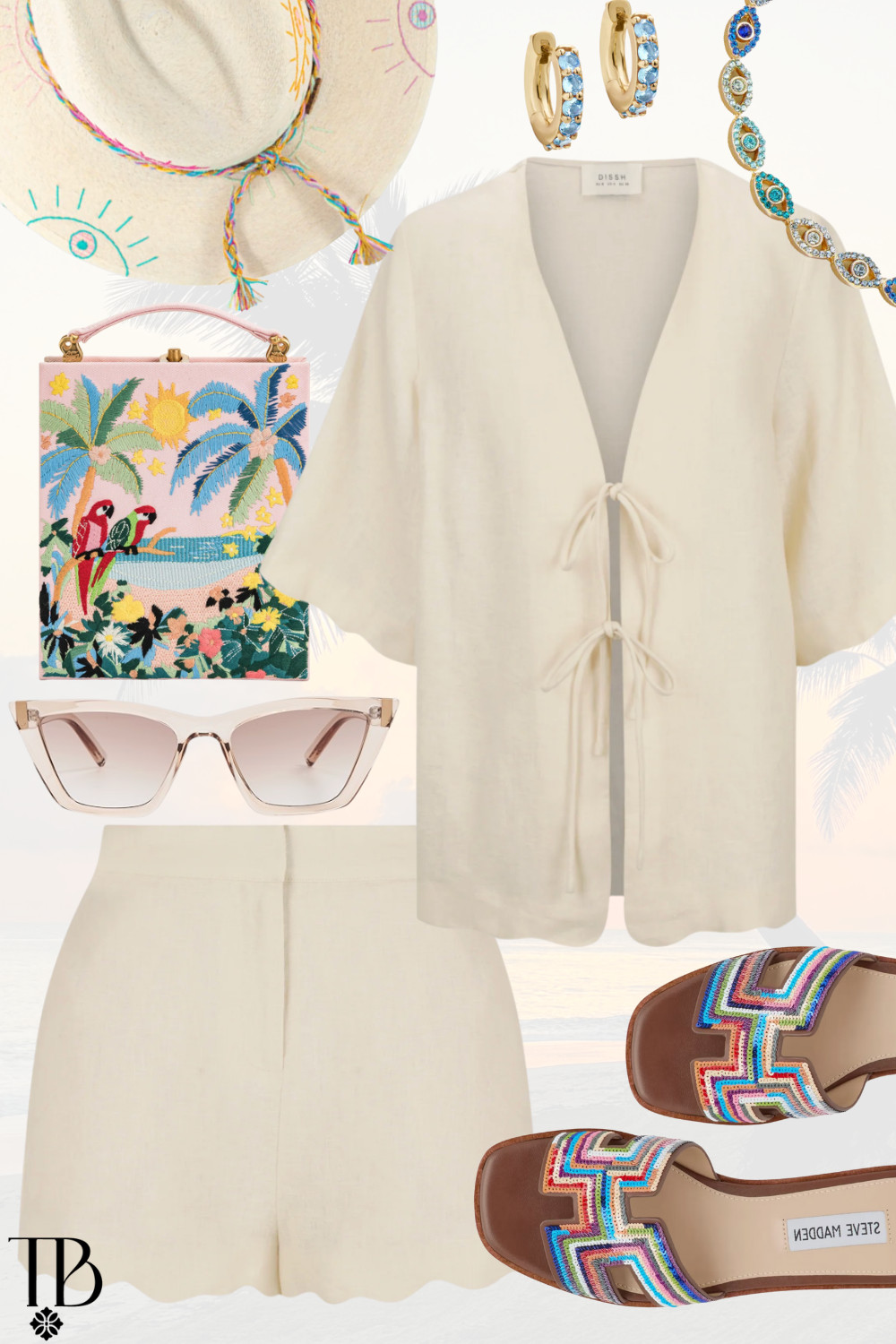This is one of those Spring Break outfit ideas that has my name written all over it! I’m a sucker for a linen set, especially when it’s dressed up with fabulous pops of color. I mean these scalloped shorts and the matching top just screams Spring Break beach vacation. I also can’t get over the vibrant colors in this clutch, the colorful hat, and fun sandals!