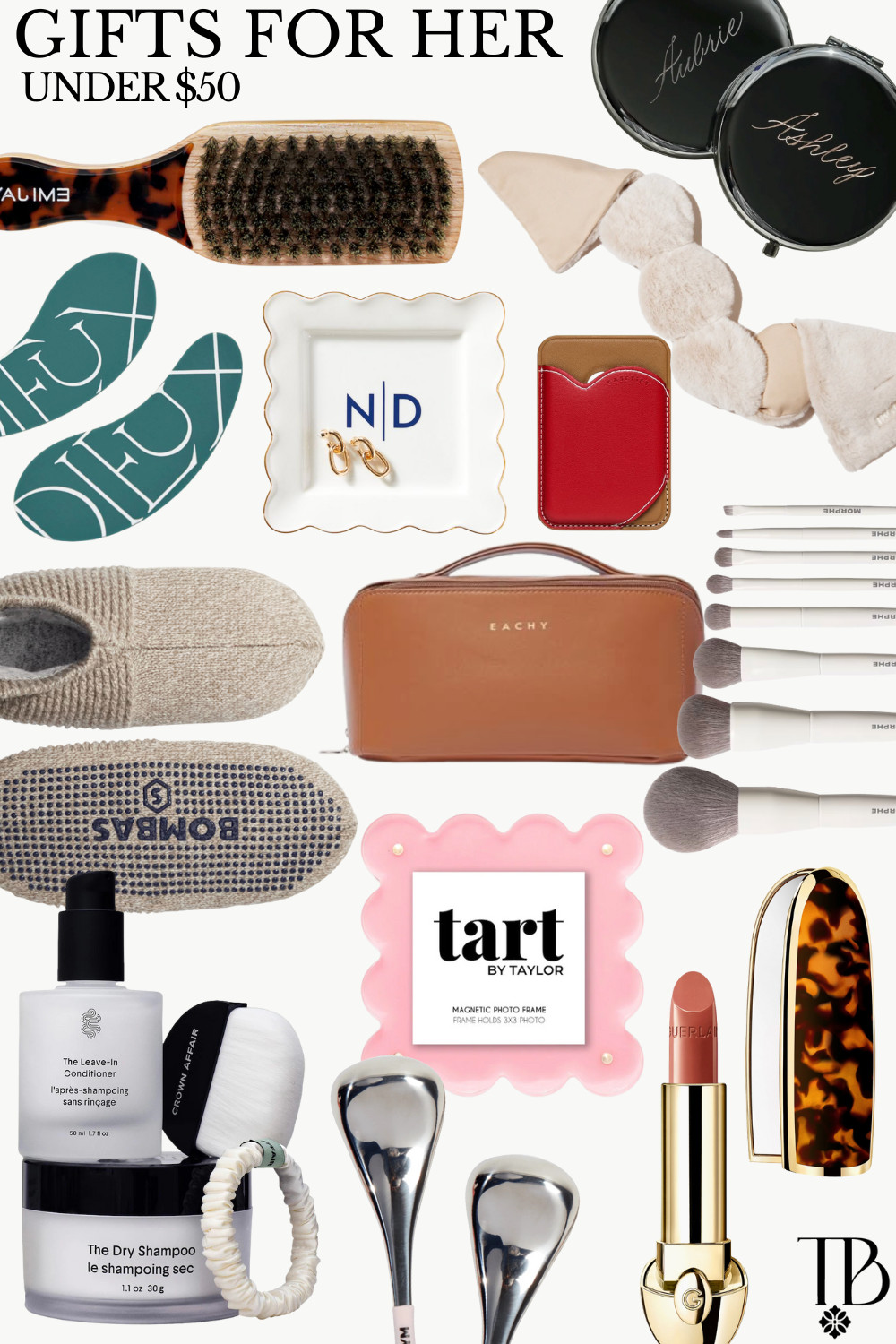 There is no shortage of fabulous holiday gifts under $50. I use these coffee mugs every day and recommend them to anyone. This engraved compact mirror is a standout choice for the cool girl who already has it all! I also share these Bombas gripper slippers every year because they are just that good, especially for the homebody in your life.